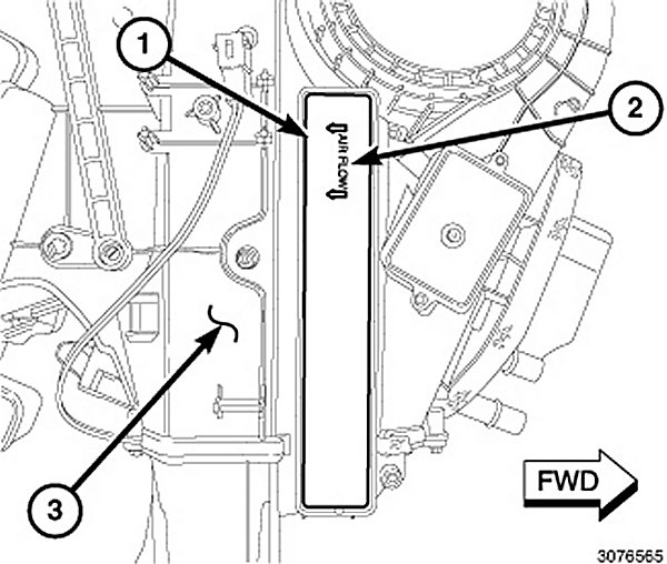 1. Install the particulate air filter (1) into the right side of the HVAC housing (3). Make note of the air flow direction (2).