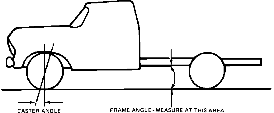 Alignment equipment indicates a true reading only when frame is horizontal. Measure left and righthand angle as shown in Fig. 6. If frame is not level (due to tire, spring or load differences), the caster angle reading must be modified to compensate for frame angles. If front is higher than rear, subtract amount of angle from reading. If front is lower than rear, add angle. Check frame angle with a protractor and take frame angle measurement on flat area immediately adjacent to rear spring front hanger. Axles are not to be bent or twisted to correct caster or camber readings.