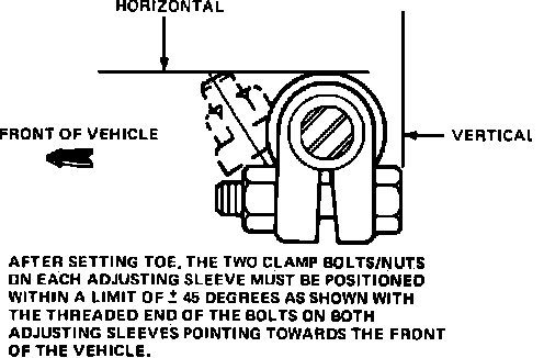 1. Loosen clamp bolts at each end of spindle connecting rod tube, then rotate the sleeve until correct toe alignment of {1/32} inch is obtained.