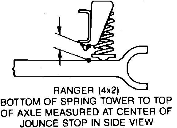 To determine riding height, measure distance between bottom of spring tower and top of axle, Figs. 4 and 5. Refer to ``Wheel Alignment Specifications Chart'' to determine alignment specifications for the particular riding height of truck. If riding height does not fall within specifications, it should be corrected by installing proper springs or by use of shims.