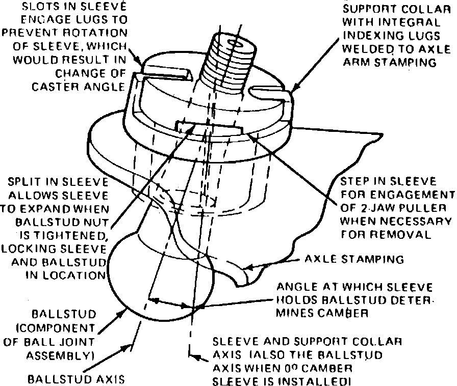 4. Install camber adjuster on top ball joint stud with arrow pointing outboard for positive camber or inboard for negative camber, Fig. 8. Zero camber bushings will not have an arrow and may be turned in either direction as long as the lugs on the yoke engage the slots in the bushing.
