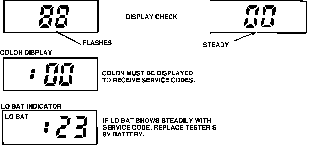 To receive the service codes, press the button at the front of the STAR tester. The button will stay down and a colon will appear in the display window in front of the 00 numerals. The colon must be displayed to receive the service codes. To clear the display window during the self-test, turn ignition switch to OFF position and press tester button once (colon will disappear), then press tester button down again (colon will appear). Every time the STAR tester is turned OFF, the low battery indicator (LO BAT) should show briefly at the upper left corner of the display window. If the LO BAT indicator shows steadily at any other time during the operation of the STAR tester with any service code, turn power switch to OFF position and replace tester's 9 volt battery.