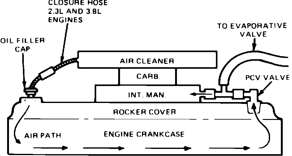 The PCV system prevents blowby gases from escaping by routing them through a vacuum controlled ventilating valve and a hose into the intake manifold. The blowby gases mix with the air/fuel mixture and are burned in the combustion chambers. When the engine is running, fresh air is drawn into the crankcase through a tube or hose connected to the air cleaner housing.