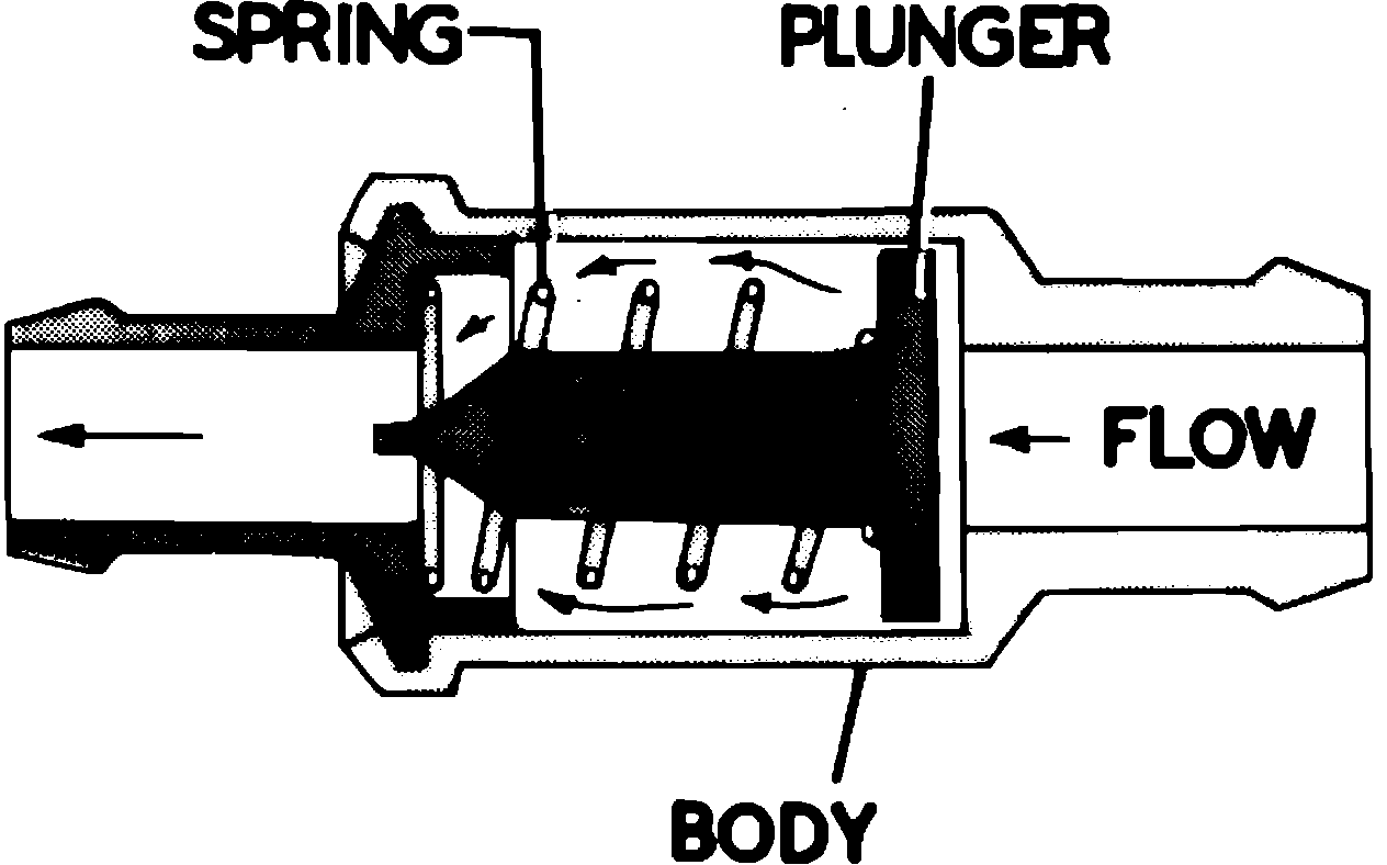 The PCV valve, Fig. 63, consists of a needle valve, spring and housing. When the engine is off, the spring holds the needle valve closed to stop vapors from entering the intake manifold. When the engine is running, manifold vacuum unseats the valve allowing crankcase vapors to enter the intake manifold. In case of a backfire in the intake manifold, the valve closes, stopping the backflow and preventing ignition of fumes in the crankcase. During certain engine conditions, more blowby gases are created than the ventilator valve can handle. The excess is returned through the air intake tube to the air cleaner and carburetor where it is burned in the engine.