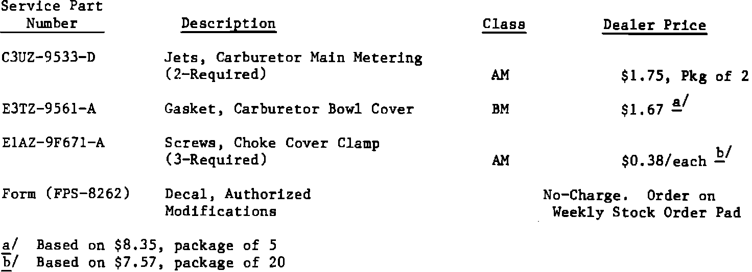 3. Replace carburetor main metering jets with new jets, (Part Number C3UZ-9533-D). When reinstalling carburetor bowl cover, use new bowl cover gasket, (Part Number E3TZ-9561-A).