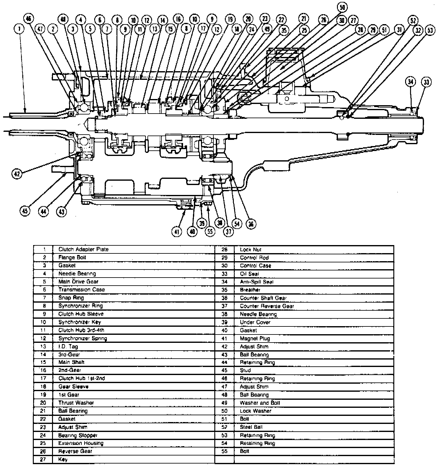 1. Remove bell housing-to-transmission case attaching nuts, then the bell housing and gasket.Sectional View Of Toyo Kogyo (Models W/Gasoline Engine) 4-Speed Manual Transmission: