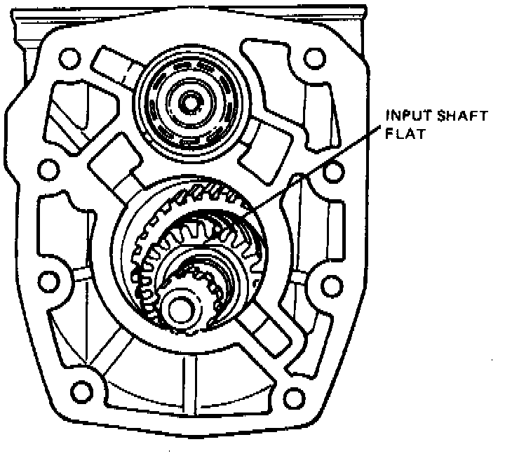 28. Rotate both shift forks so that main gear train will fall to bottom of case. Remove shift forks. Rotate input shaft so that one of two flats on input shaft face upward.