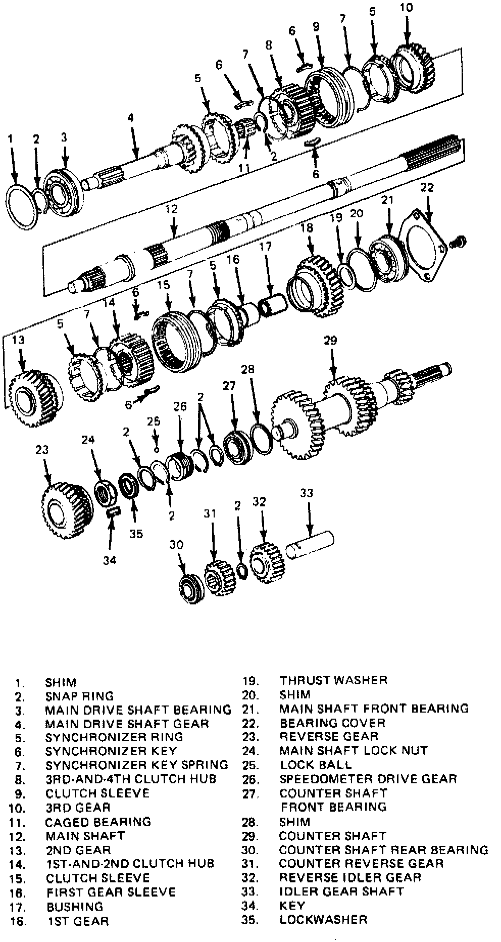 35. Remove input shaft from transmission case then remove synchronizer ring and caged bearing from main driveshaft.