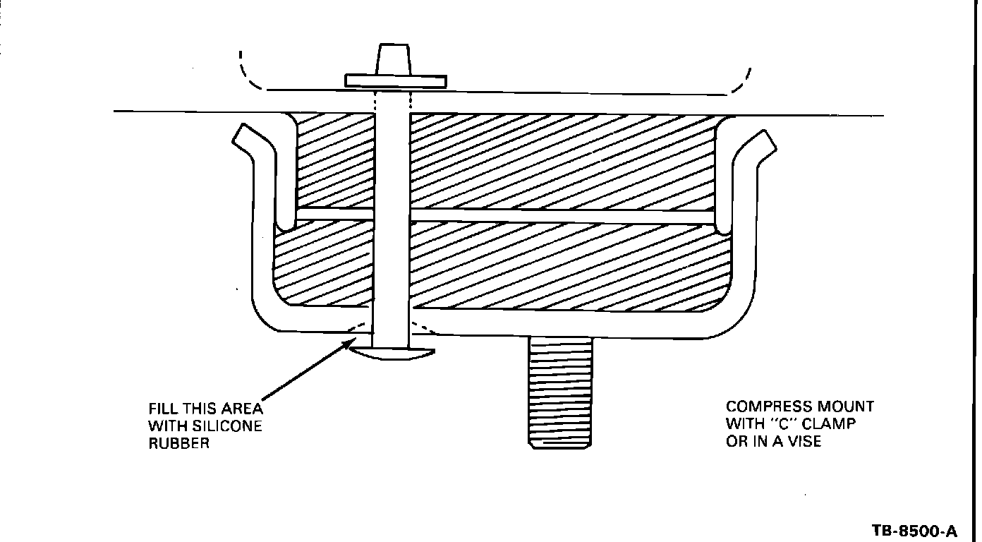 3. Clean the area under the retainer pin head. Fill this area completely with Silicone Rubber (D6AZ- 19562-A or B) and let it cure for 5 minutes before unclamping the mount.