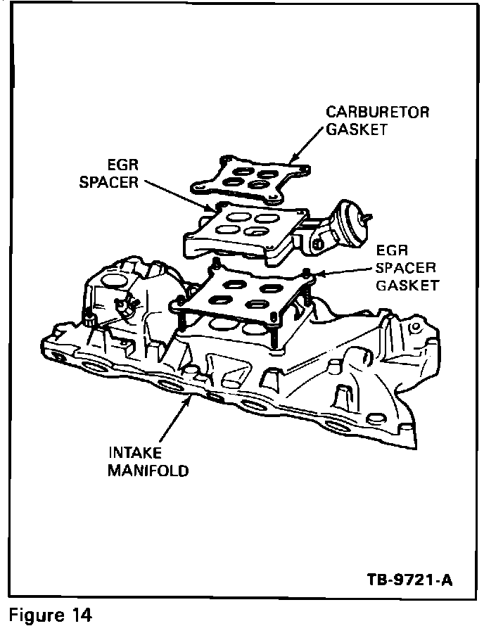 11. Remove the EGR spacer-to-intake manifold gasket and the carburetor-to-EGR spacer gasket and throw them away, Figure 14.