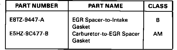 12. Thoroughly clean gasket mating surfaces and install a new service EGR spacer-to-intake manifold gasket, (E8TZ-9447-A) and carburetor-to-EGR spacer gasket, (E5HZ-9C477-B).