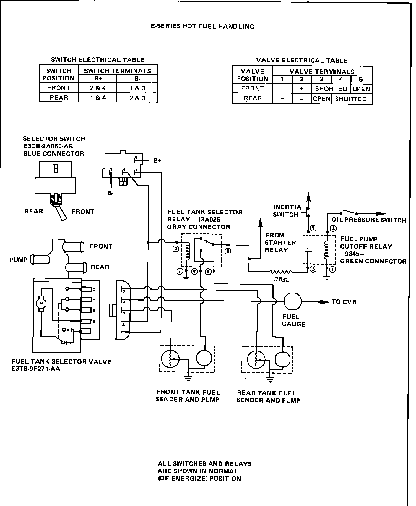 The input power to selector relay terminal number 3 is provided by two sources: direct from the starter solenoid during the crank mode only, or through a 0.75 ohm resistance wire connected to terminal number 3 of the fuel pump cutoff relay. The resistance wire reduces slightly the voltage supplied to the in tank pump during normal operation. The fuel pump cutoff relay coil receives its power through terminal number 2 from an engine activated oil pressure switch which is closed only when the engine is running and the relay coil is grounded through terminal number 1. Power to run the fuel pumps is supplied through an inertia switch to terminal number 4 of the fuel pump cutoff relay.