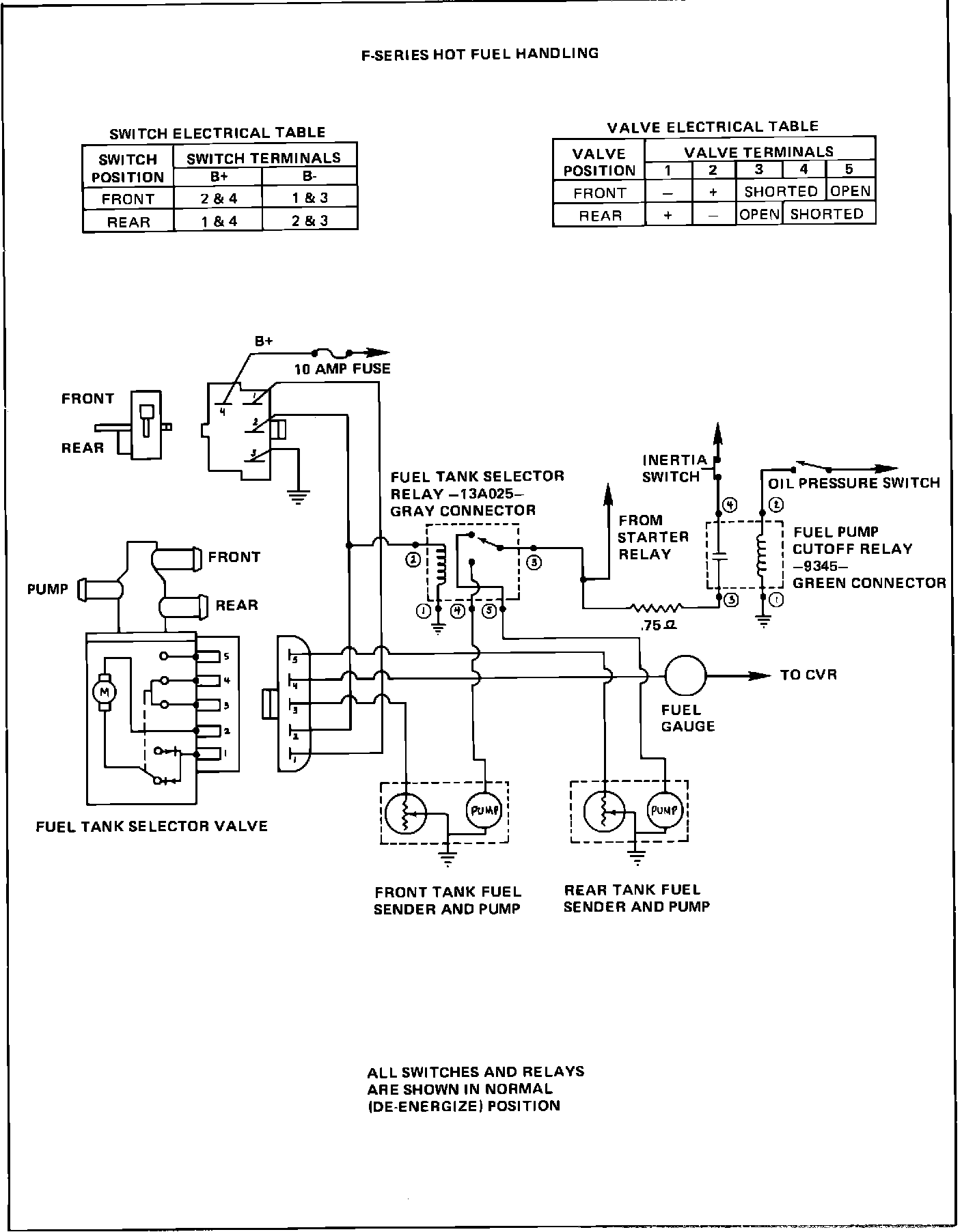 pump to run only when the front tank is selected and the rear pump to run only when the rear tank is selected). Relay terminal number 1 is connected to ground to complete the relay coil circuit. Relay terminal number 4 supplies power to the front tank pump and terminal number 5 supplies power to the rear tank pump.