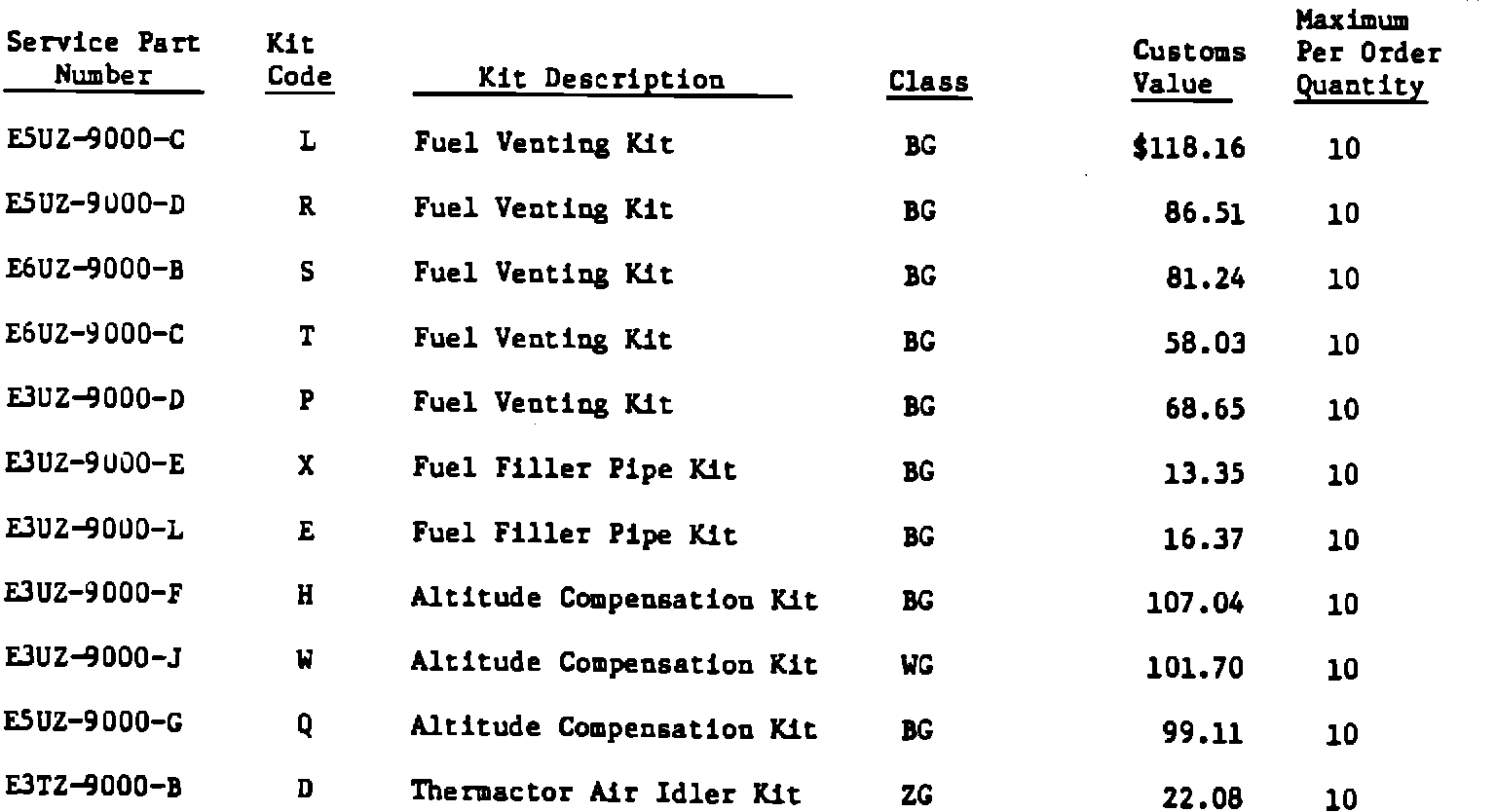 Parts will not be "direct shipped" for this recall. A maximum order quantity has been established to preclude unnecessary stockpiling. Do not order recall parts from Windsor Export Supply. Order all requirements directly from Wixom using the mailing address on page No. 1 of this Bulletin. For more urgent handling, use cable address "RECALLS - FORDEX, WIXOM, MICHIGAN". For locations having telex facilities, our telex Ford private line code is FED and commercial telex code is 669777 answerback Ford FIES WIX. Our telephone number in Wixom, Michigan, is area code (313) 344-5641. Please give the part number, description, quantity and recall number when ordering. Modification kit ordering information is as follows: