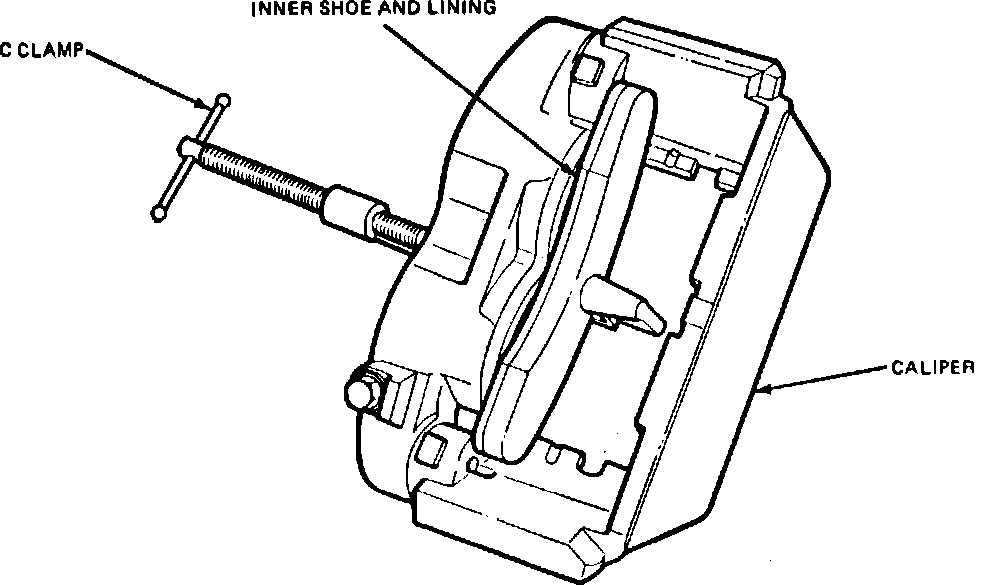 1. Place used inner lining and shoe assembly over the pistons, then place a C-clamp on the caliper housing midway between the two pistons over the lining and shoe assembly, Fig. 3. Tighten the clamp until pistons are bottomed in caliper, then remove C-clamp and lining and shoe assembly.
