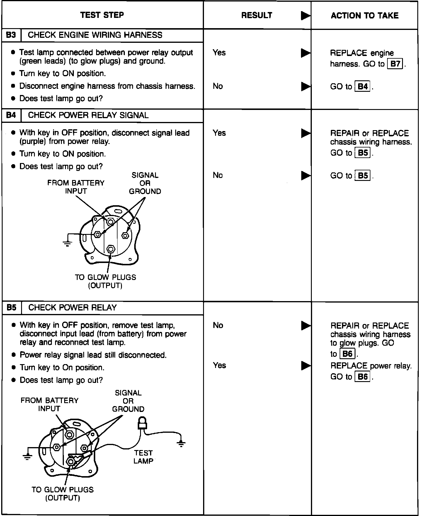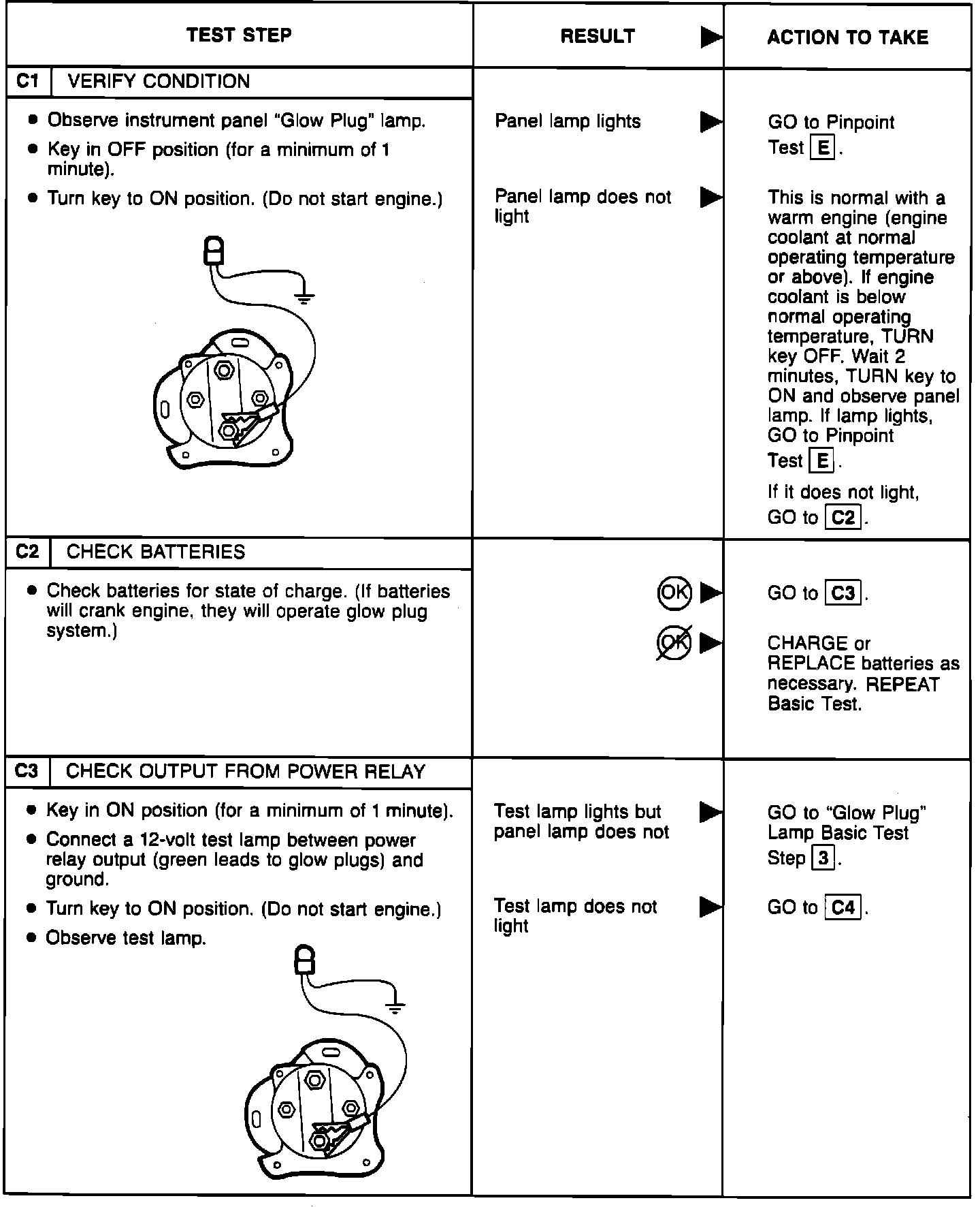 BASIC TESTPerform the glow plug system diagnostic test (referred as Basic test) first. If the vehicle passes the Basic test without running any Pinpoint tests, you will know the glow plug system is functioning properly. The vehicle's problem exists somewhere else other than the glow plug system. If a step of the Basic test fails, run only the Pinpoint test specified by the failed step. Refer to glow plug diagnostic test point chart for test lamp connections and glow plug system wiring harness test points. Perform only those services specified by the Pinpoint tests. Operation of the glow plug system is completely automatic. If after completing a specific Pinpoint test it is determined that a component must be replaced, the glow plugs should be disconnected until the system has been rechecked by repeating the Basic test to make sure the glow plug system works properly.