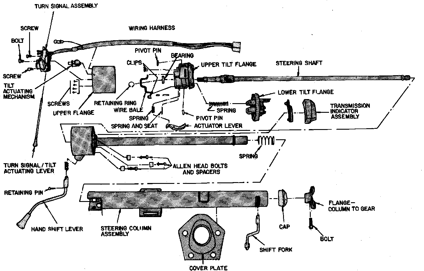 14. Remove tilt mechanism, steering shaft and ignition actuation rod from steering column upper end.