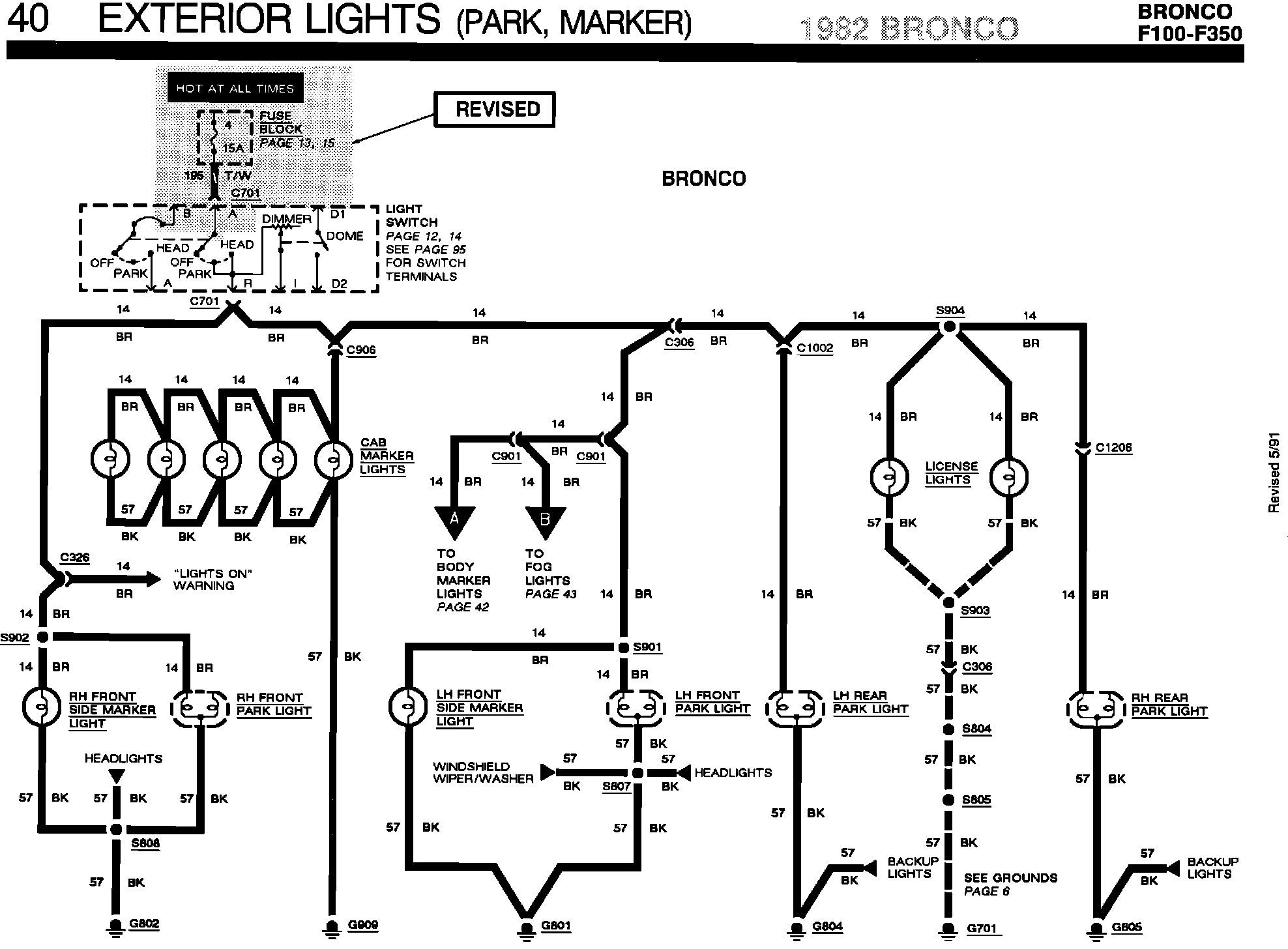 ^ ELECTRICAL/VACUUM TROUBLESHOOTING MANUAL - 1982 - PAGE 40 - EXTERIOR LIGHTS CONNECTIONS TO LIGHT SWITCH REVISED