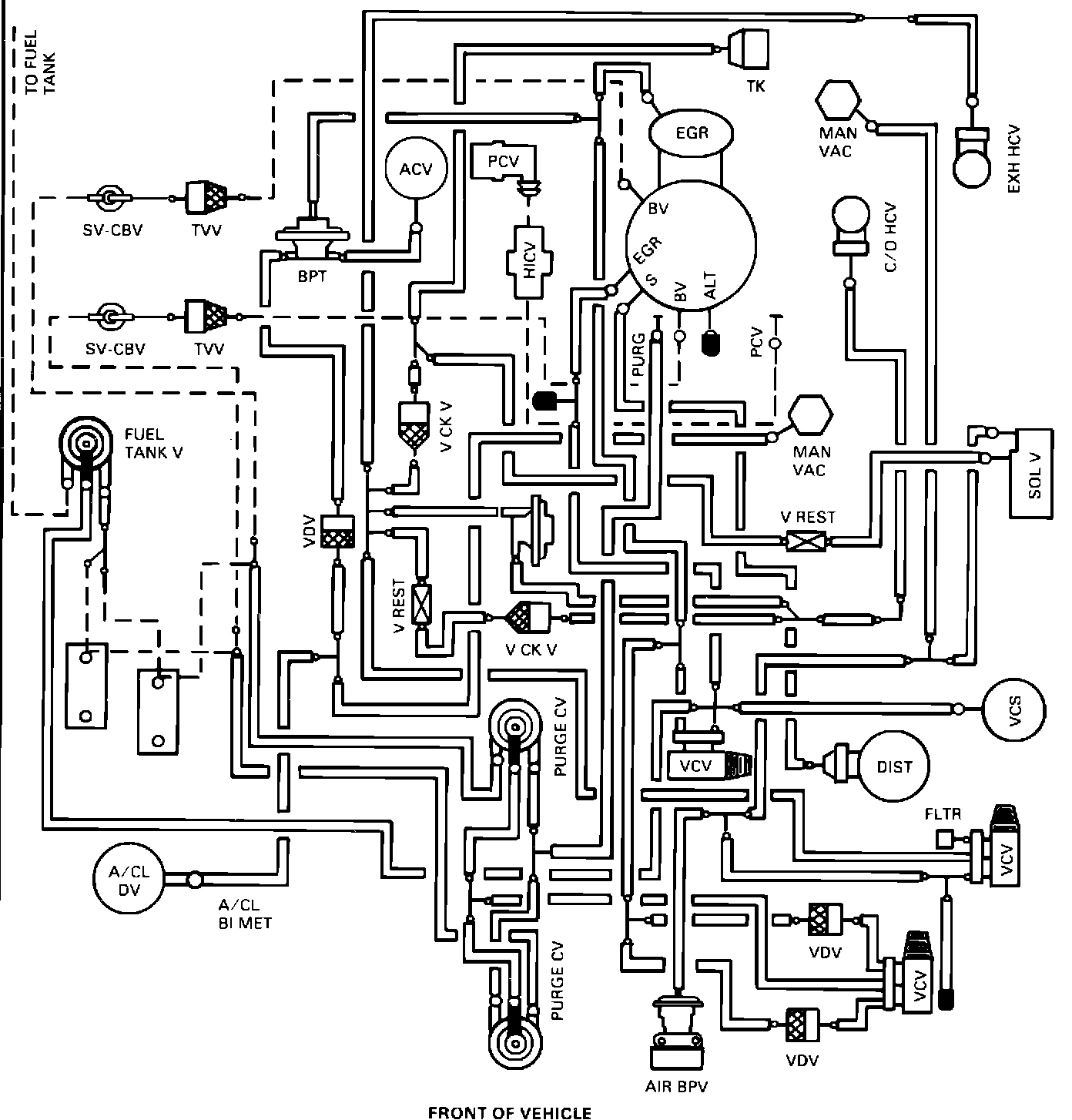 a. Cut 5/32" diameter vapor line between the steel vapor return line and the plastic three-way connector ("Y" on F Series/Bronco and "T" connector on E Series) leading to the vapor storage canisters.