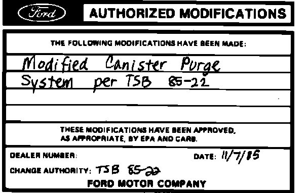 Obtain an Authorized Modifications Decal and list the date, dealer number, and summary of alterations performed. Select a prominent place adjacent to the Vehicle Emission Control Information Decal suitable for installing the Authorized Modifications Decal. Clean the area, install the decal, and cover it with a clear plastic decal shield.