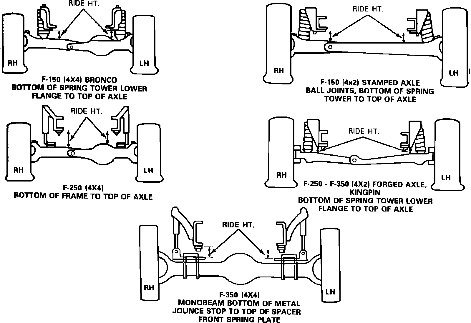 Prior to checking caster and camber, ensure vehicle front ride height is within {1/8} inch side to side 1980-87 E-100-350. On 1980-87 F-100-350 models, the left side ride height should be within 0-{3/8} inch higher than the right side ride height. On 1980-87 F-150-350 (4x4) and Bronco, the front ride heights should be within {3/16} inch side to side. Refer to Figs. 6, 7 and 8. If the vehicle ride heights are not within specifications, redistribute load on loaded vehicles or slightly load empty vehicles on one side. If the ride heights cannot be brought within specifications, verify correct spring installation. The ride height variations stated, are for checking purposes only. The vehicle does not have to operate within these specifications. Check and correct as necessary all tire inflation pressures, then check front tires for the same size, ply rating and load range. Check front wheel bearings and adjust as necessary.