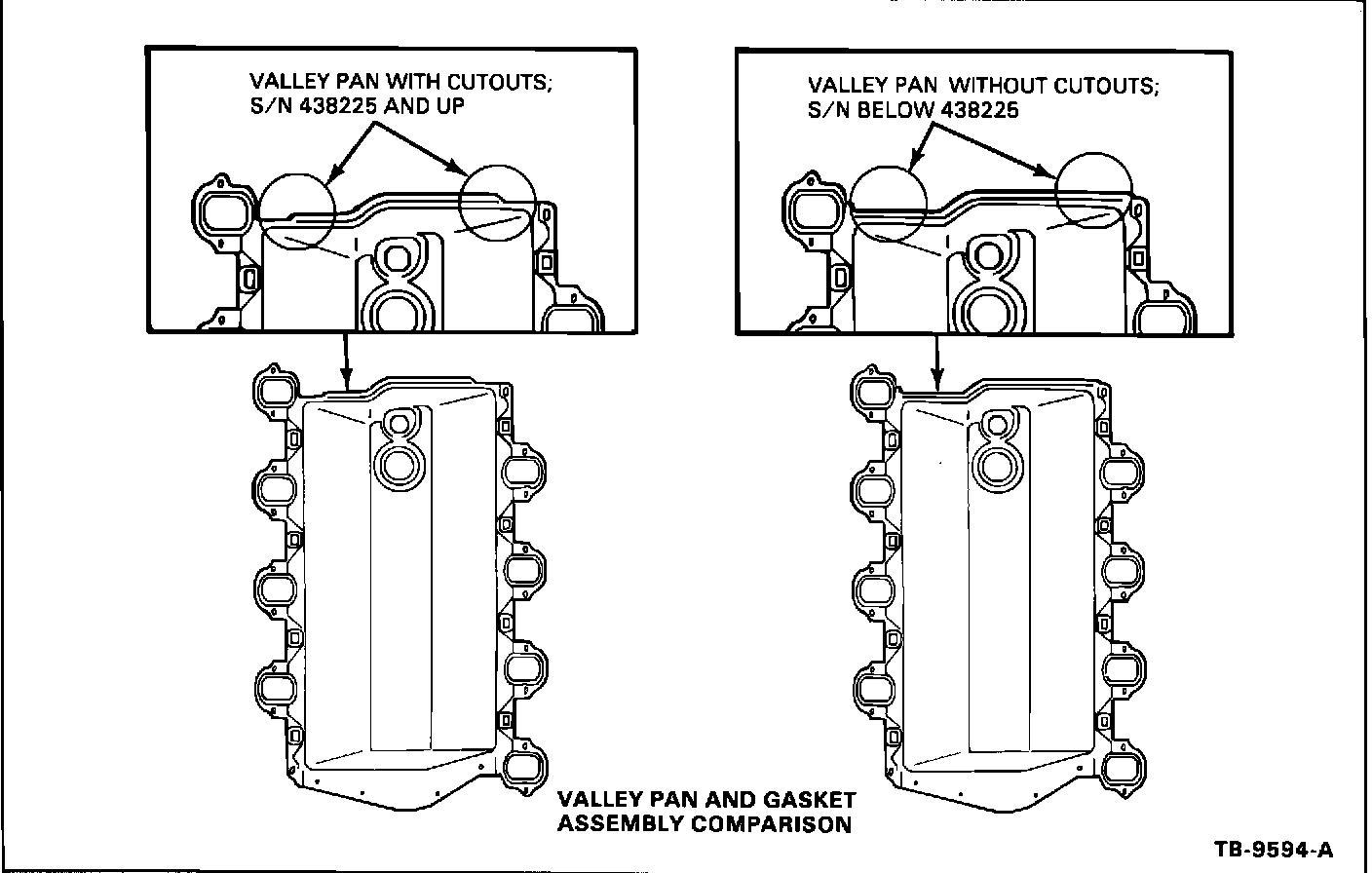ISSUE: Oil seeping from the rear corners of the intake manifold may be caused by the valley pan and gasket assembly. The valley pan and gasket assembly has rear corner cutouts that eliminate the close metal to metal contact between cylinder block-to-intake manifold mating surface. The elimination of the metal to metal contact helps the RTV sealant to form a good bond for proper sealing. The new improved valley pan and gasket assembly was installed on all 7.3L diesels and 6.9L diesels after an engine serial number of 438225.