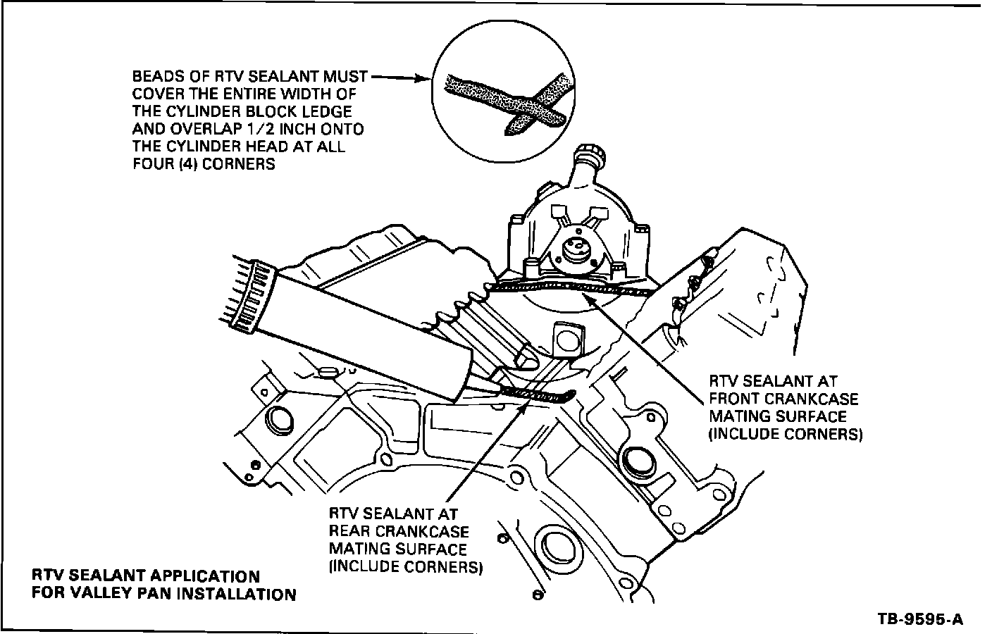 NOTE: DO NOT WIPE OFF EXCESS RTV SEALANT FROM THE VALLEY PAN AFTER INSTALLATION. ALLOW THE RTV SEALANT TO SEEP AT THE CYLINDER BLOCK MATING SURFACE.