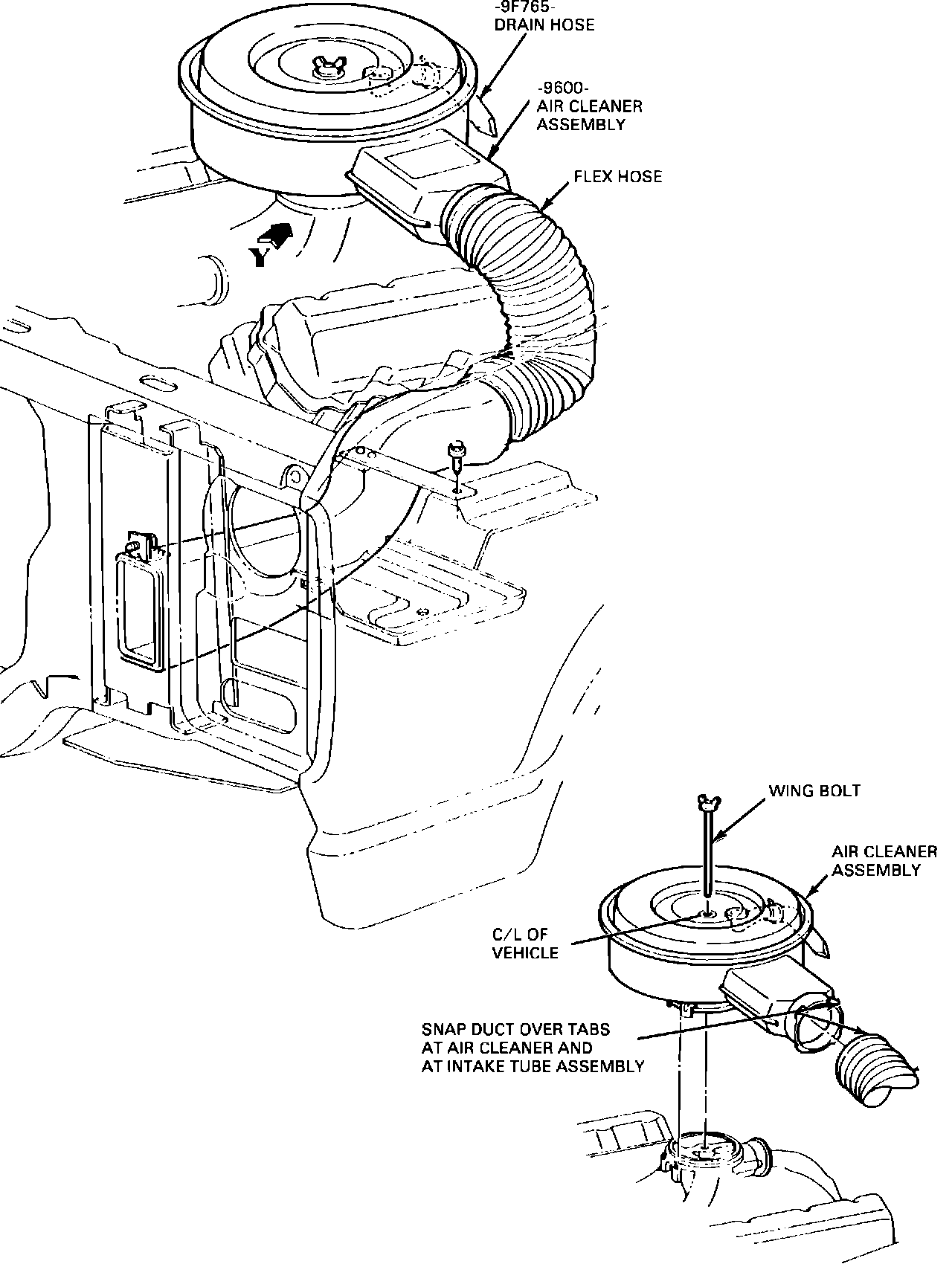 6. Check to see that the air cleaner drain hose is hanging freely behind the engine (not doubled under between the air cleaner tray and intake manifold or trapped behind the kickdown rod on automatic transmission equipped vehicles). Failure to do so could result in the system not rejecting water.