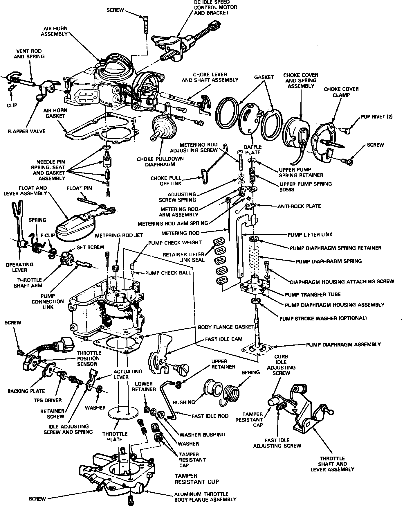 Fig. 1 Carter YFA non-feedback carburetor exploded view. 1983 - 86 shown. 1982 similar.: