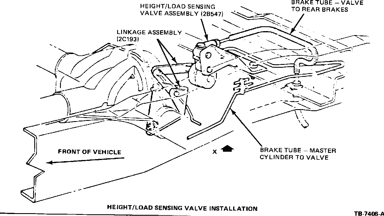 A new sensing valve assembly will have the shaft preset and secured internally. If the valve shaft of any valve turns freely - DO NOT USE. The height/load sensing brake proportioning valve (2B547) is not to be serviced or disassembled. It must be replaced as a complete assembly. If the linkage assembly (2C193) has been damaged or broken, a new sensing valve assembly must also be installed.