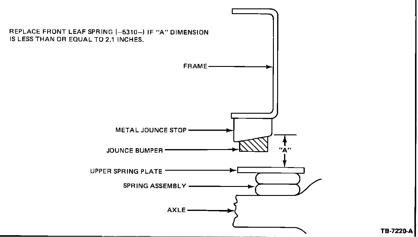 Some 1983-84 F250/350 4x4 vehicles equipped with the 6.9L diesel engine may exhibit a low front end appearance or a spring strike-thru condition during vehicle operation. If this condition is present, check the dimension between the outboard lower edge of the metal jounce bumper and upper spring plate, dimension "A" in Figure 33.