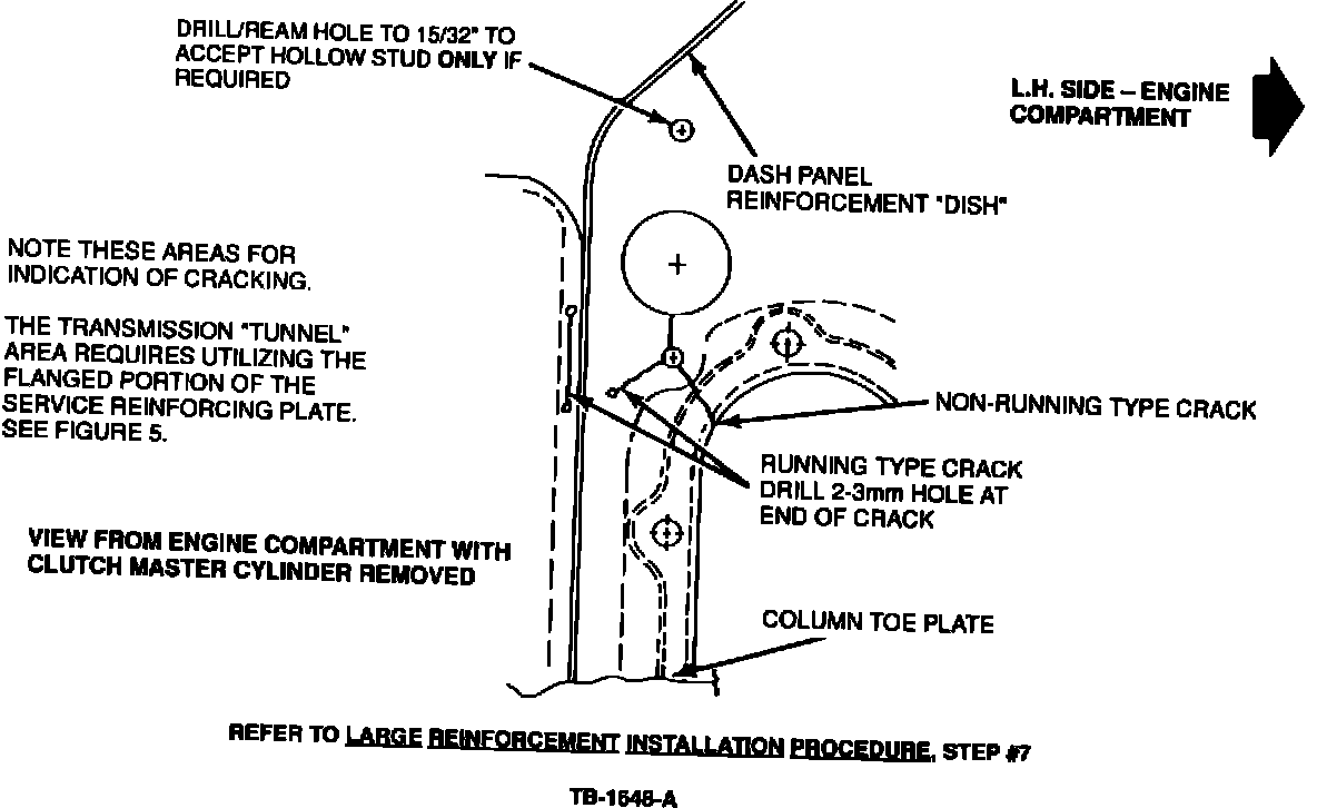 NOTE: DRILLING WILL BE EASIER IF THERE ARE NO SPOTWELDS VISIBLE THROUGH THE THREE HOLES.