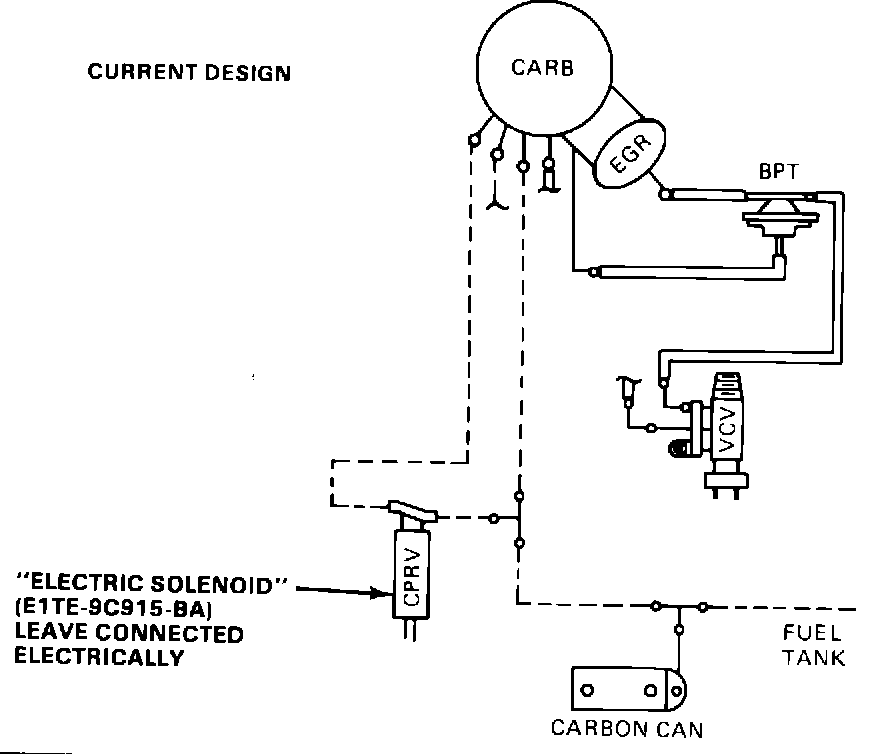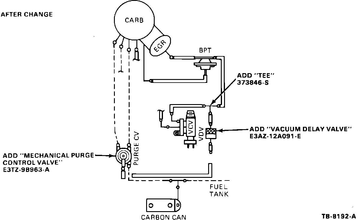 Remove only the vacuum connections on the electric solenoid (E1TE-9C915-BA) ensuring that the electrical connections remain intact, and secure the valve to its wiring loom. Electrical connections must remain intact to allow the MCU system self check to be run as required. Replace the electrical purge control valve with a mechanical purge control valve (9B963) and a vacuum delay valve (12A091). Add a "T" fitting on the hose coming from the EGR BPT and route the vacuum hose to the mechanical purge control valve and the vacuum delay valve. Hose routing is shown on the schematics (Figures 25 and 26).