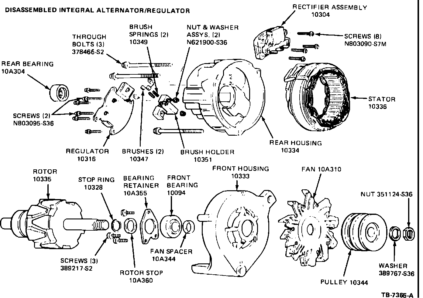 NOTE: All of the following disassembly steps may not be necessary to perform a particular test or service. Perform only those steps that apply in your case. See Figure 12 for a full disassembled view of the integral alternator/ regulator assembly. On alternators with fan shield, remove attaching clip and then remove fan shield.