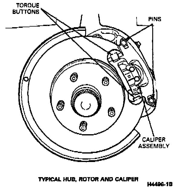 The caliper assembly consists of a pin slider caliper housing, inner and outer pad and lining assemblies, and a single piston. The caliper assembly slides on two pins which also attach the caliper to the spindle.