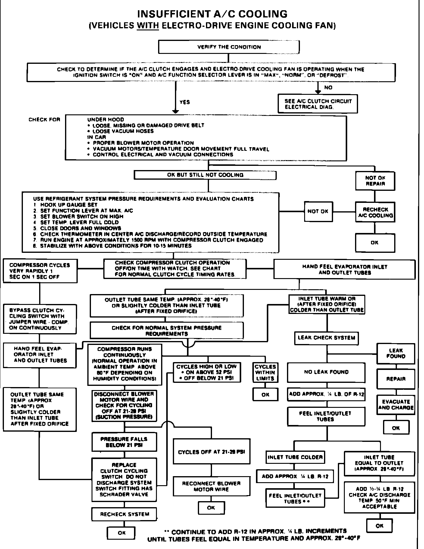 5. If the pressures are above 46 psi and the clutch cycle rate is faster than the normal rate of 2 to 5 cycles per minute, the system is probably low on refrigerant. Check that the system contains the correct refrigerant charge by following the correct diagnostic chart (Figures 1 or 2).