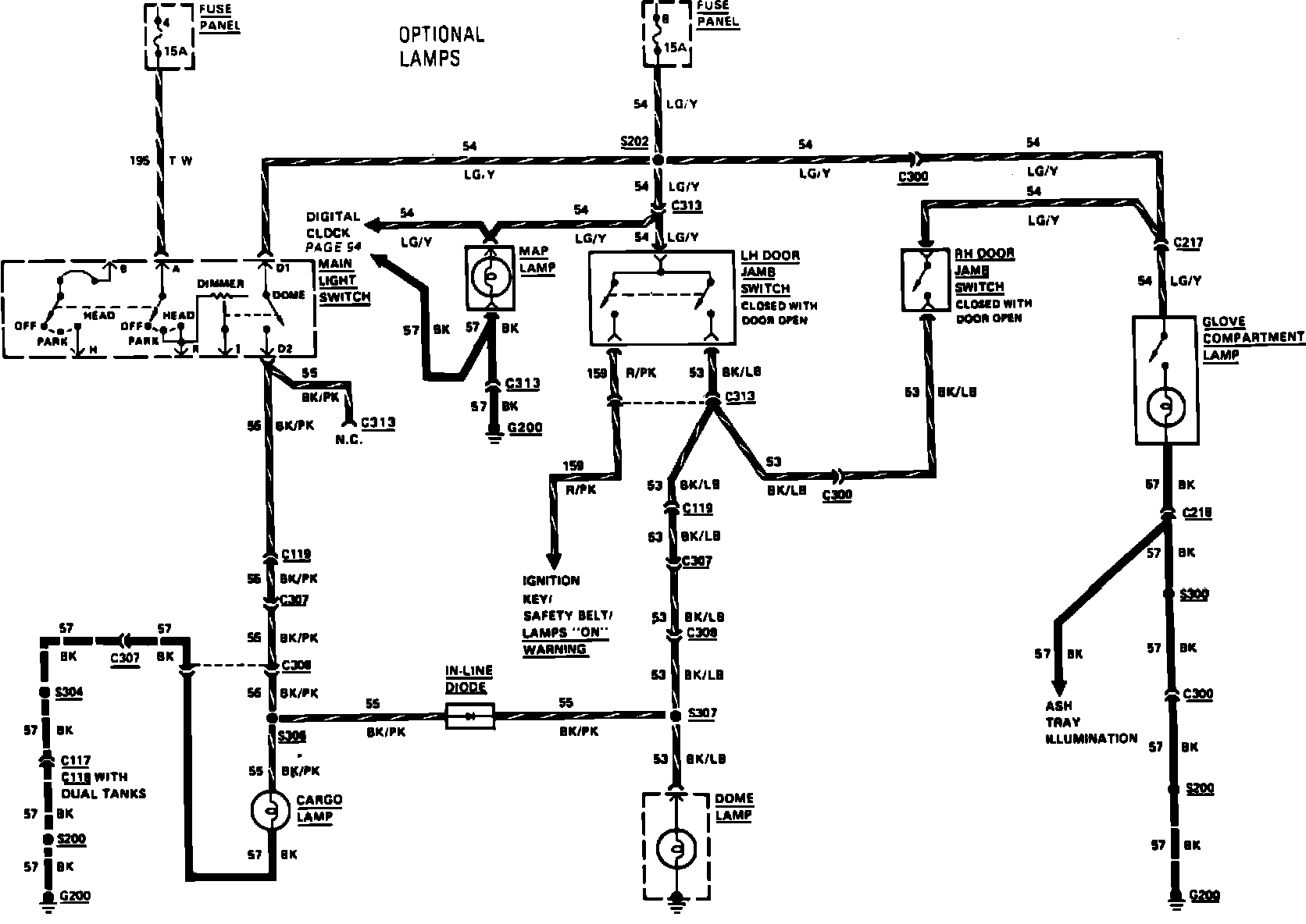 Fig. 25 Dome, Cargo Lamps & "Lights On" Warning Wiring Circuit. 1984 Ranger With Optional Lamps: