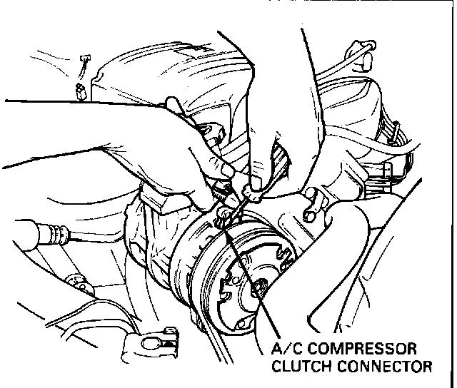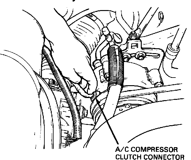 3. With vehicle engine turned off, disconnect the electrical connector at the A/C clutch. If electrical connector is hard to reach, disconnect pressure switch at suction/accumulator.