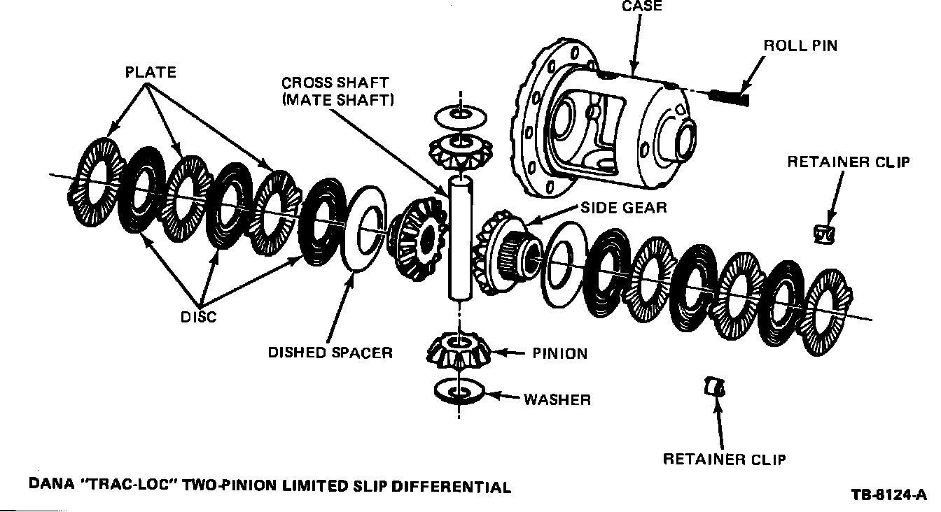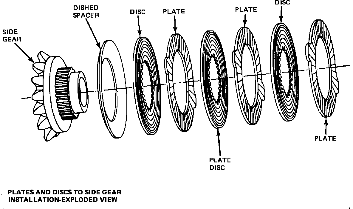 Each clutch plate and disc pack consists of steel plates, set between the case and the side gear. The clutch plates, having external lugs, are locked to the differential case by the external lugs. The clutch plate that is installed next to the case is a Belleville spring plate. This plate is installed with the concave (dished) side against the case. The remaining clutch discs have internal spline teeth which lock to the splined hub on the side gear. The side gear is, in turn, splined to the axle shaft and acts as a pressure plate against the clutch pack. Since the side gear fits against the pinions on the cross shaft (mate shaft), any outward force exerted by the cross shaft and its pinions will press the side gear against the clutch pack and thus connect the differential case directly to the axle shaft.