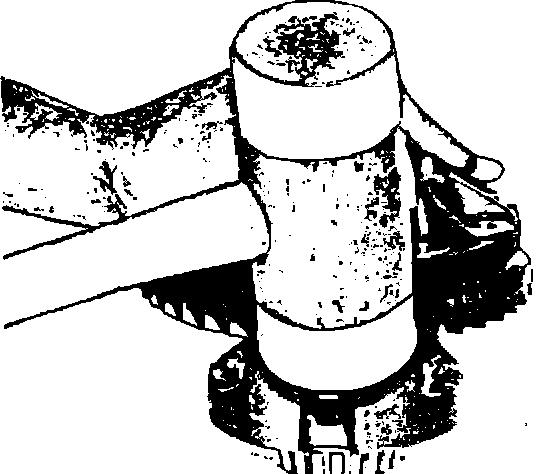 2. Remove differential case assembly from vise and remove ring gear as shown by tapping with a rawhide type hammer to free it from case. It will be necessary to remove the ring gear to allow clearance for the removal of the cross pin. (See Figure 14).