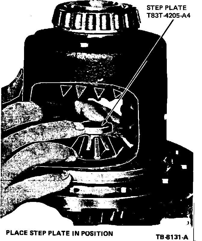 4. Assemble the step plate into the side gear. Apply a small amount of grease, Multi-Purpose Long-Life Lubricant, C1AZ-19590-B(ESA-MMC75-B)or equivalent into the centering hole of the step plate.