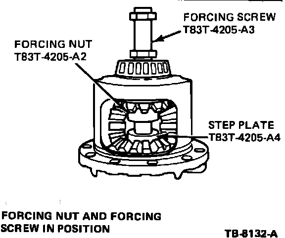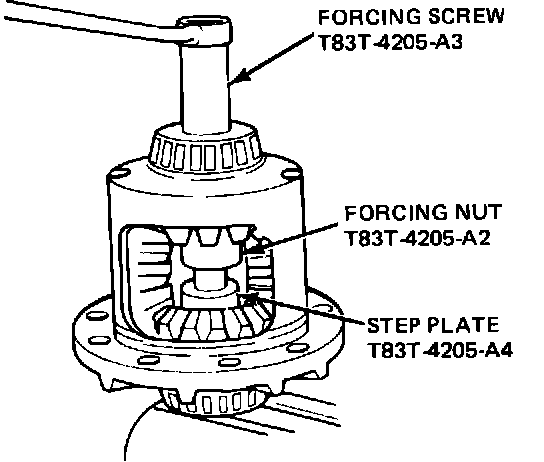 6. Hold the side gear and Step Plate T83T-4205-A4 in position by hand. Insert the Forcing Screw T83T- 4205-A3 down through the top of the case so it is piloted in the side gear and thread Forcing Nut, T83T-4205-A2 on the screw. The tip of the Forcing Screw must contact the Step Plate.