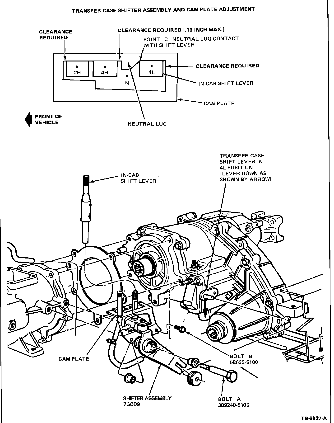 5. Move the transfer case in-cab shift lever to all shift positions to check for positive engagement. There should be clearance between the shift lever and cam plate in the 2H front, 4H rear (clearance not to exceed .13 inch), and 4L rear shift positions.