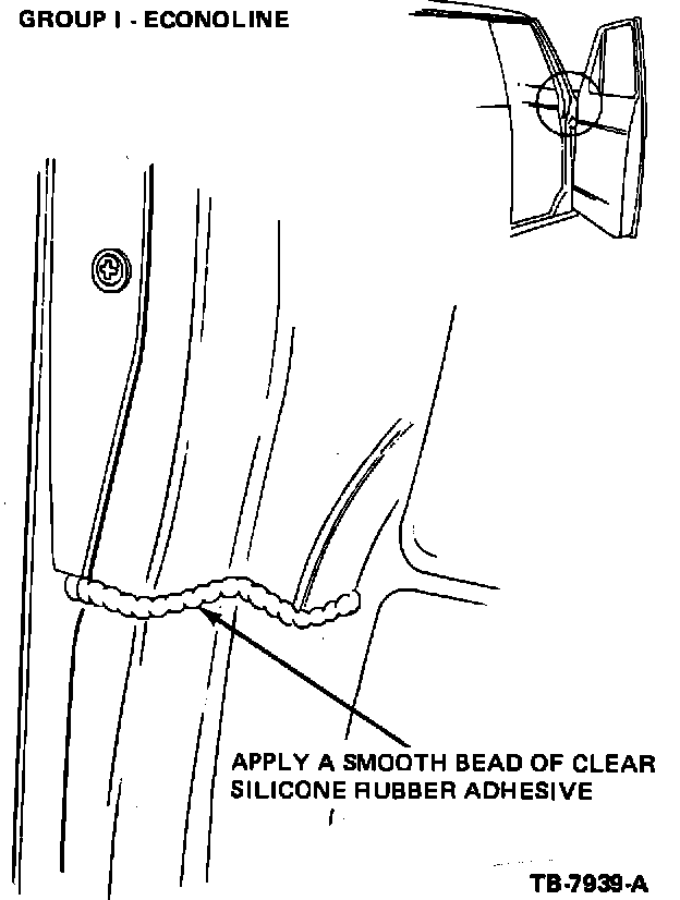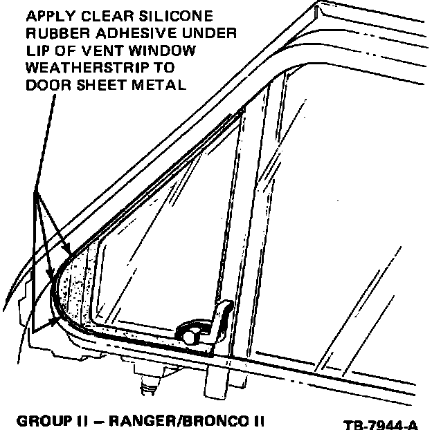 Correction - Apply clear silicone rubber adhesive under lip of vent window weatherstrip to door sheet metal as shown in Figure 19.