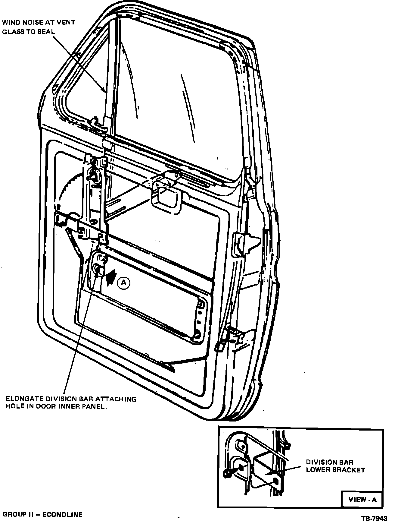 Concern - Wind noise at vent glass to seal. Correction - Check for vent window frame distortion by removing the lower division bar attaching screw. If division bar moves, elongate attaching hole in door inner panel to allow distortion free attachment of division bar as shown in Figure 18.