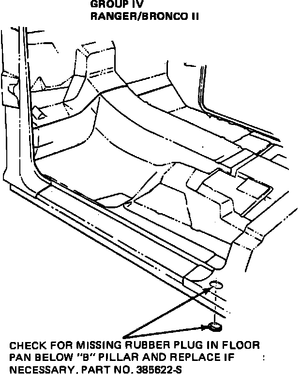 Correction - Check for missing rubber plug in floor pan below "B" pillar and replace if necessary. Part No. 385622-S, see Figure 24.
