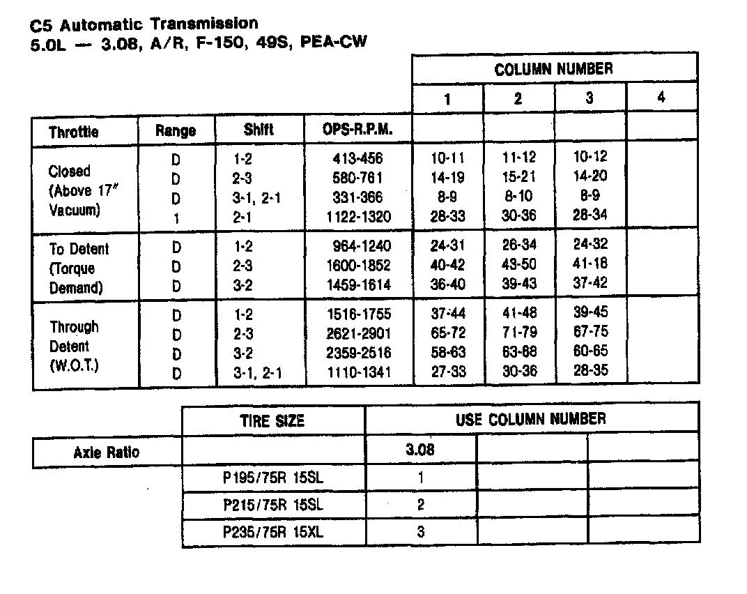 C5 3-spd A/T, Shift Speeds (5.0L F-150):