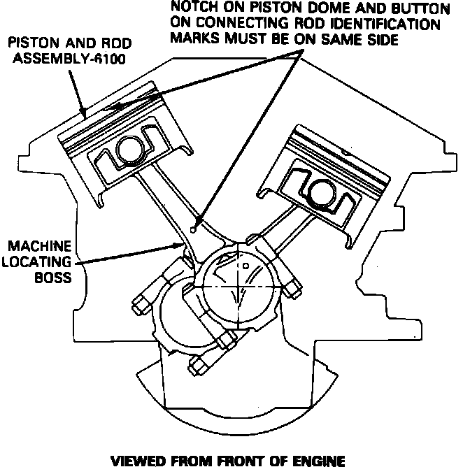 Assemble rod to piston with notch on piston dome on the same side as button on connecting rod, Fig. 10. When installing piston and connecting rod assembly in engine, notch on piston dome must face front. After installing connecting and piston assembly, check connecting rod side clearance. Connecting rod side clearance should be .006 to .014 inch.