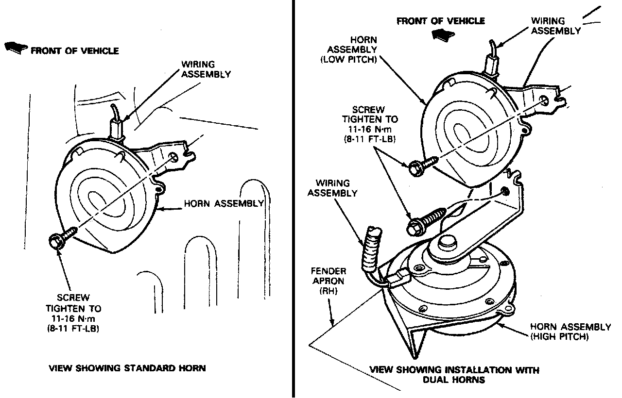 Disconnect the horn wire from the terminal and remove the mounting bolt. When installing a horn and bracket assembly, tighten the mounting bolt 11-16 Nm (8-11 ft-lb).