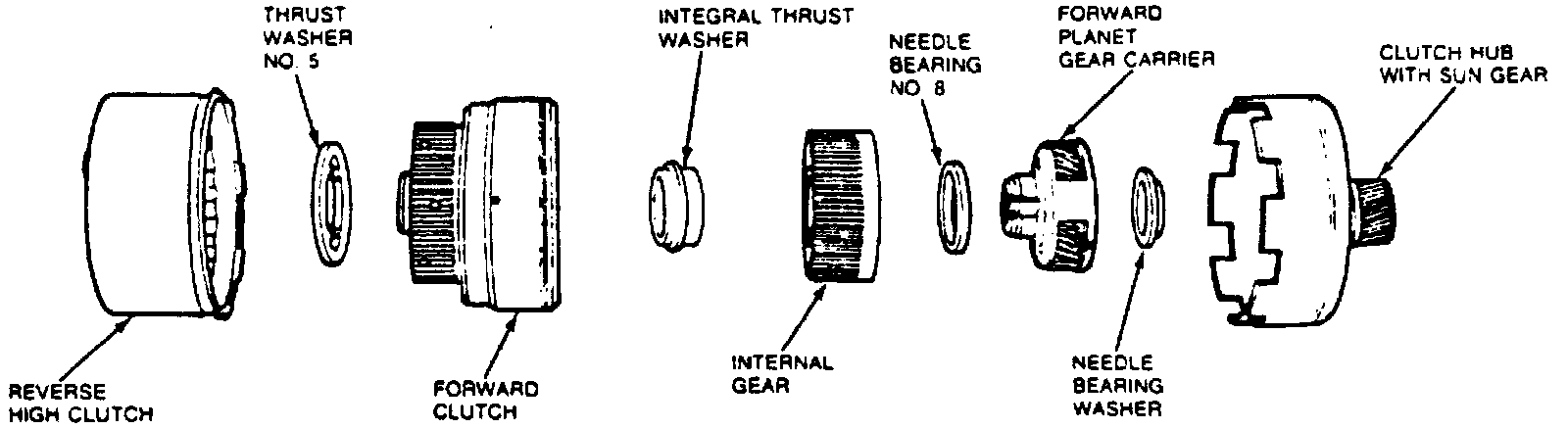 5. Position needle bearing washer into forward planet gear carrier and install clutch hub and sun gear.